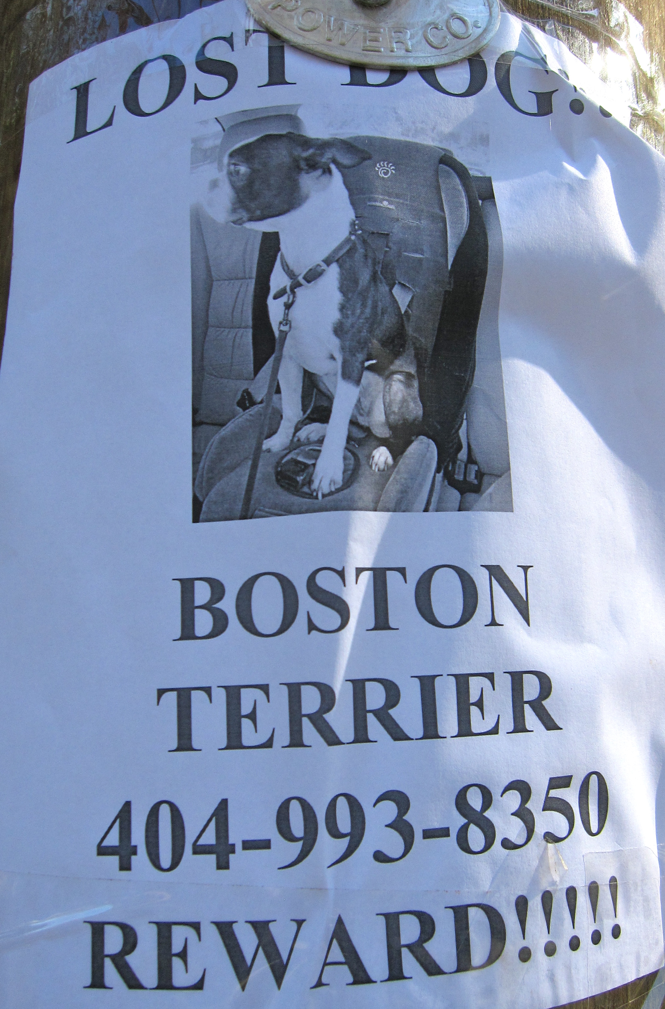 “Lost Dog, Boston Terrier.  404-993-8350.  Reward!!!!!”