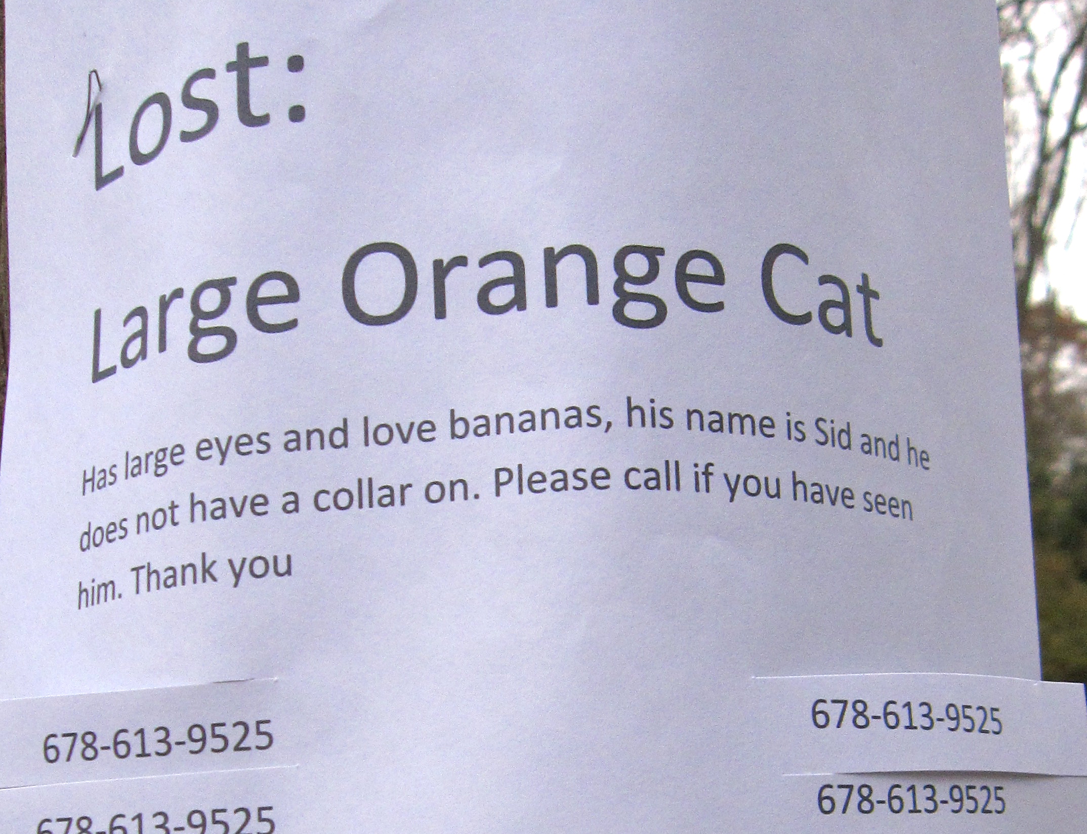 “Lost: Large Orange Cat.  Has large eyes and loves bananas, his name is Sid and he does not have a collar on.  Please call if you have seen him.  Thank you.  678-613-9525.”  Sid went missing from a home on East Lake Dr. near the Eastlake MARTA on December 8, 2010.  He’s a 2 year old orange tabby w/ white chest; here’s a photo: