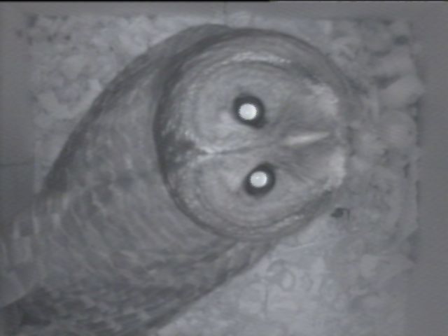 And then…! We saw movement in the dimming light as one of the owls spread open its huge 3 1/2 ft wingspan and swooped down from its perch and then up to its next chosen perch: our barred owl box! I ran inside to make sure our “owl cam” was recording images from inside the owl box. YES! It was! For the first time since we hung the box on Feb. 2, our camera caught an owl inside it. Although she only snooped around in the box for 3 minutes this time, it still made our day to see her checking out the new real estate, possibly for next year’s consideration. When she left the box, she and her husband flew off to look for supper in the woods behind our house. We went in the kitchen and heated up some pizza with smiles on our faces.