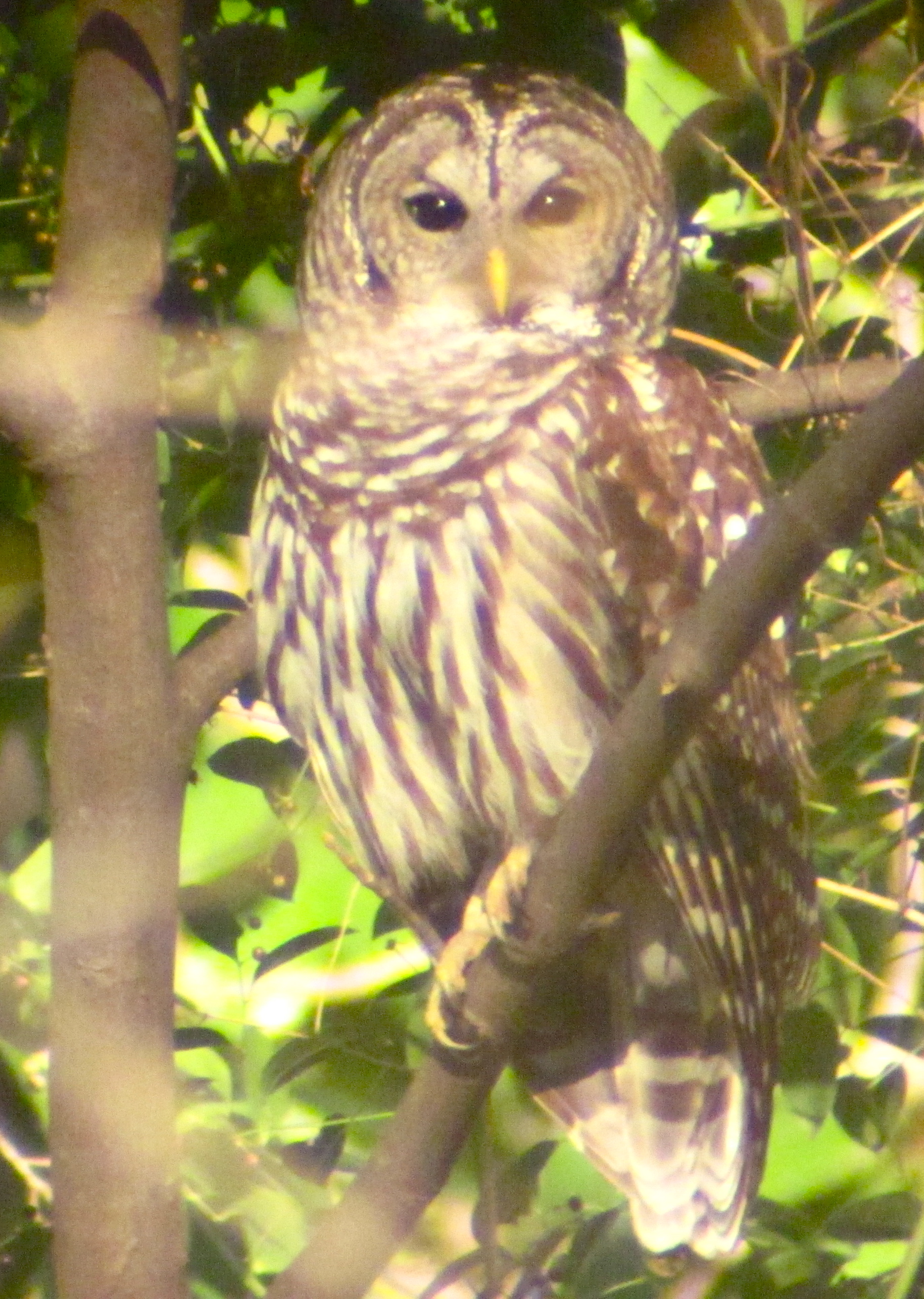 If you’ve been lucky maybe you’ve seen them a lot, but no matter how many times I see our Barred Owls, I feel lucky every time. I wanted to share my excitement with you in case you haven’t had a good look at one of our neighborhood’s most vocal birds and apparently one of its most bountiful breeders. How many of you moms and dads can say you’ve raised one or two new babies every year?
